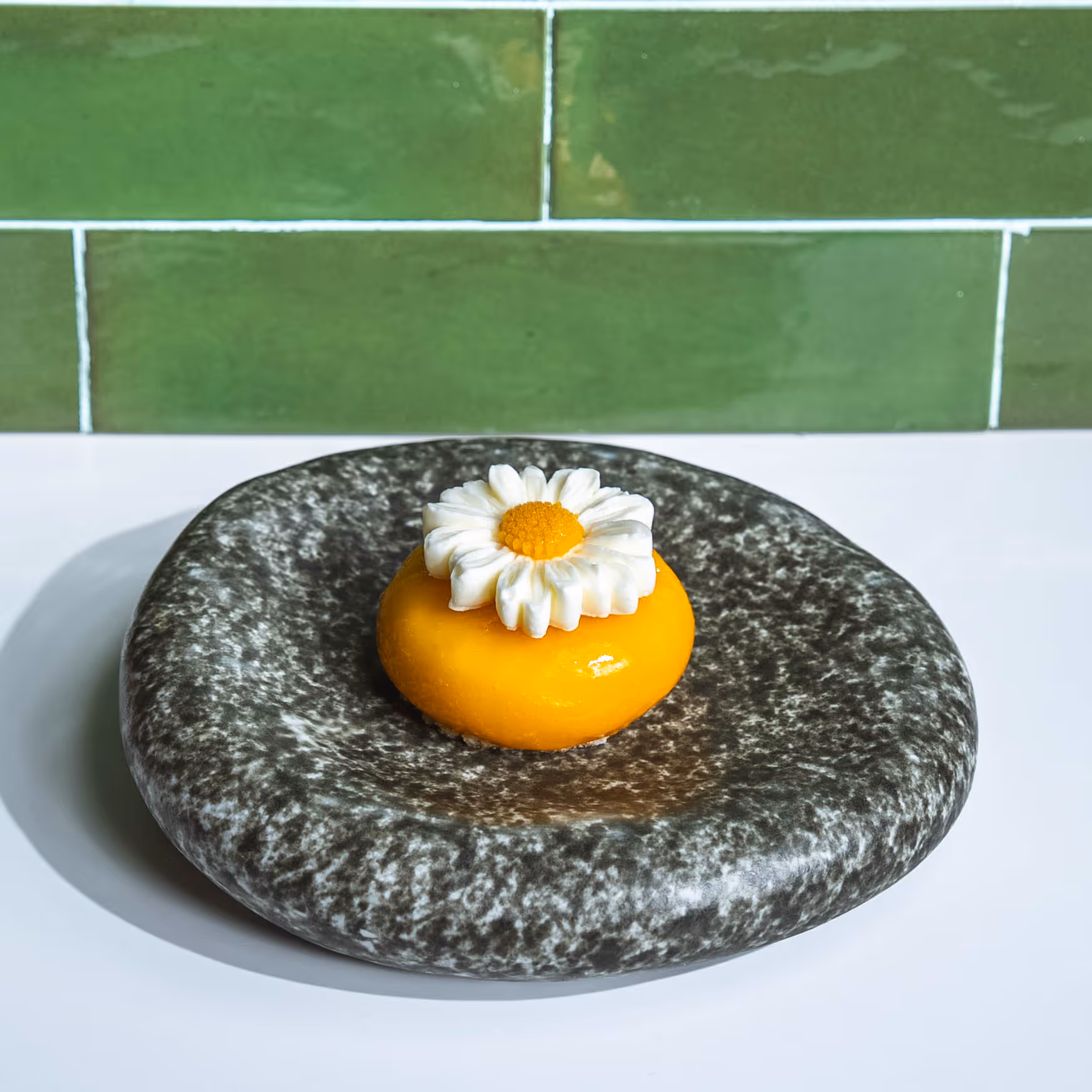 A refreshing tropical dessert featuring light yogurt mousse layered with a tangy mango–passion fruit insert, resting on a fragrant basil sponge and a crispy hazelnut crunch base, finished with a glossy mango and passion glaze for a vibrant, elegant finish.