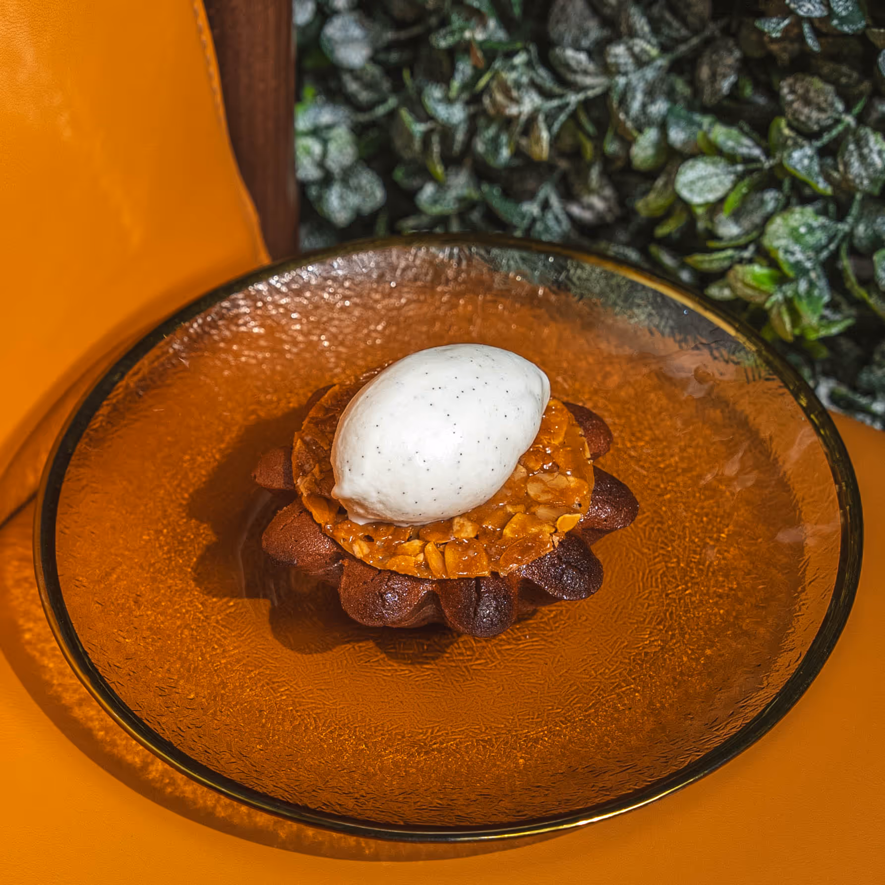 Molten chocolate fondant with a rich ganache core, topped with almond tuile and finished with Madagascar vanilla ice cream