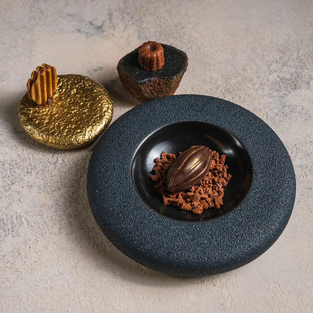 Milk chocolate caviar, 66% chocolate disc, coffee, mascarpone mousse, ladyfingers